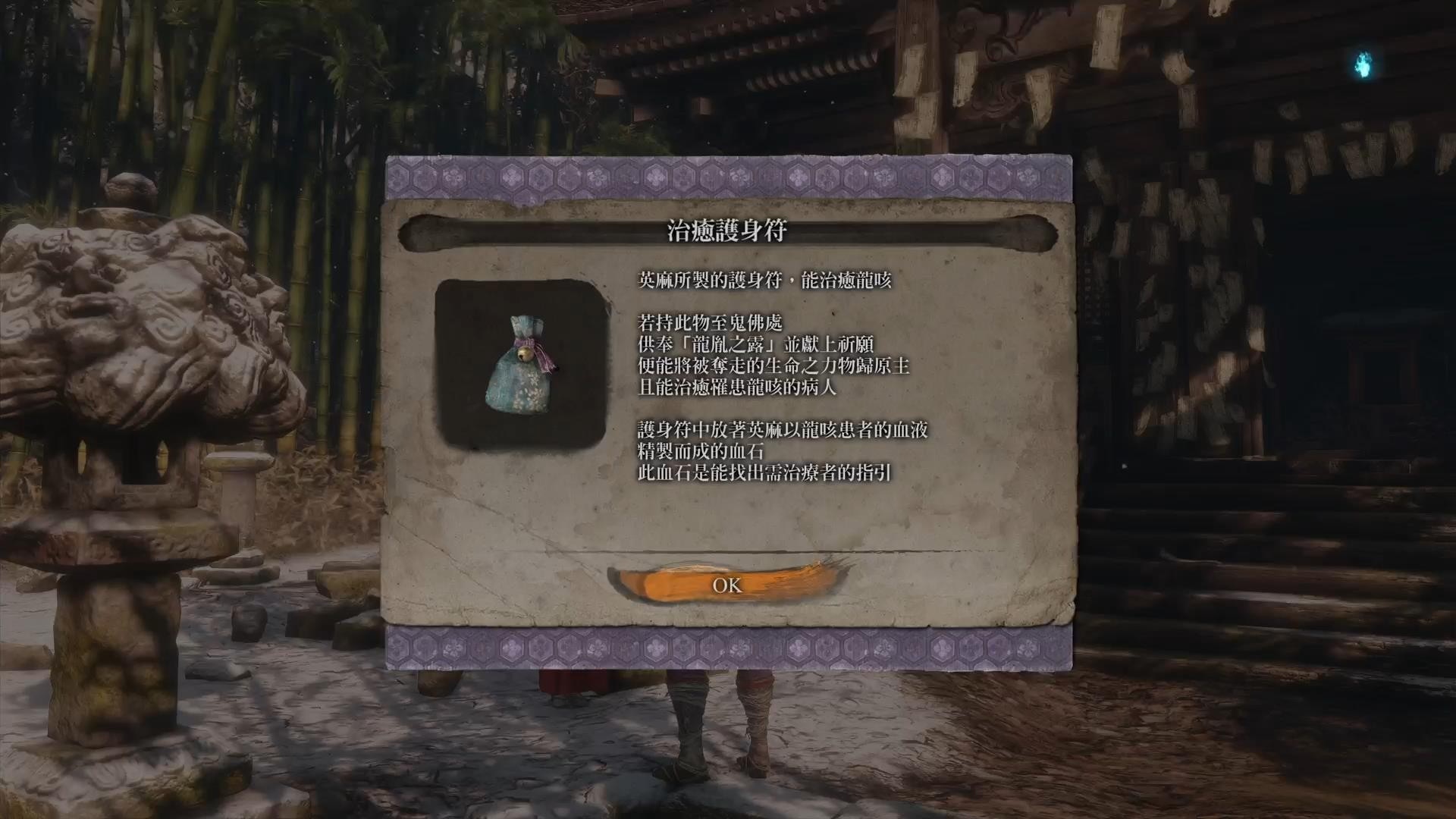 5.再到鬼佛处休息一次找英麻对话,她已经找到医治龙咳的方法,并会给你治疗护身符和一个龙胤之露。