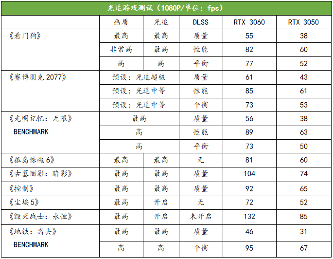 从光栅化游戏的表现来看,RTX 3050能够实现RTX 3060大约70%~80%的帧速表现,和规格上的差距一致。RTX 3050在测试的绝大多数3A游戏中(1080P/最高画质)都能接近或超过60fps的帧速流畅运行,部分游戏即使没有达到60fps,稍微降低一档画质或开启DLSS也能轻松实现60fps。而在电竞和网游中,也能以超过100fps的电竞帧速流畅运行。