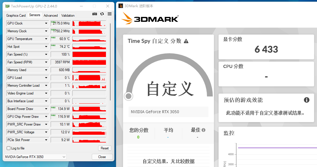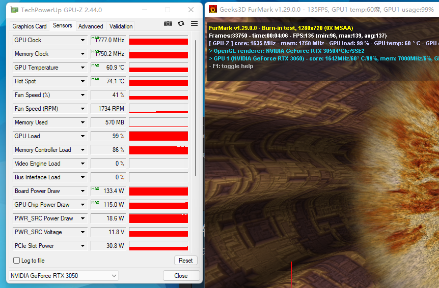 在室温20℃的办公室环境中,使用FurMark对七彩虹战斧GeForce RTX 3050 DUO 8G进行连续半小时的考机,其温度稳定在60.9℃,考机频率为1777MHz,整板功耗为133W。玩家们使用550W左右的电源即可满足其使用需求。