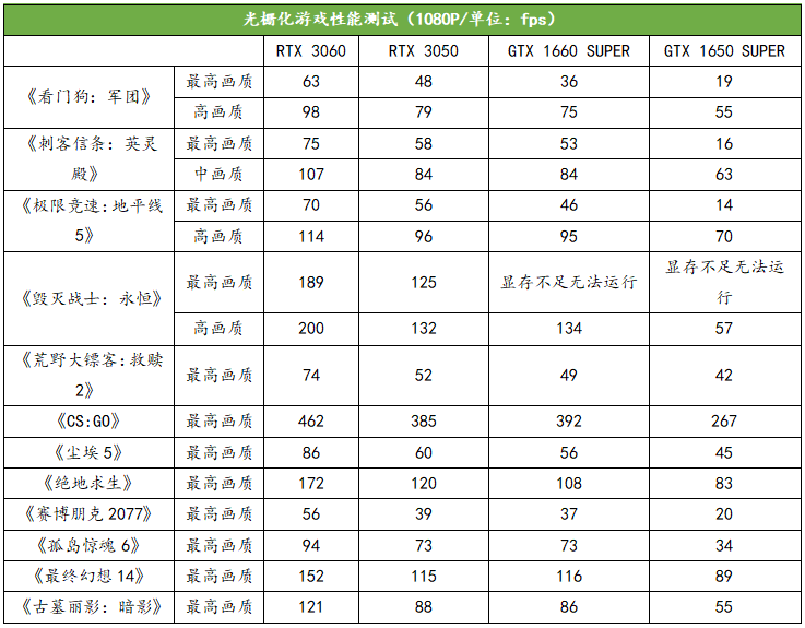 对比上代的“50”系列GPUGTX 1650 SUPER的话,RTX 3050的优势就非常明显了,即使没有“爆显存”,两者的性能差距也不在一个档次上。使用上一代入门级GPU的玩家可以考虑升级了。