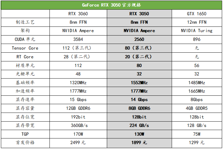 NVIDIA RTX 3050的首发定价为1899元,价格差不多也是RTX 3060的七成出头。同时,RTX 3050也是首款配备了8GB显存且定价在千元级光追入门桌面端GPU。