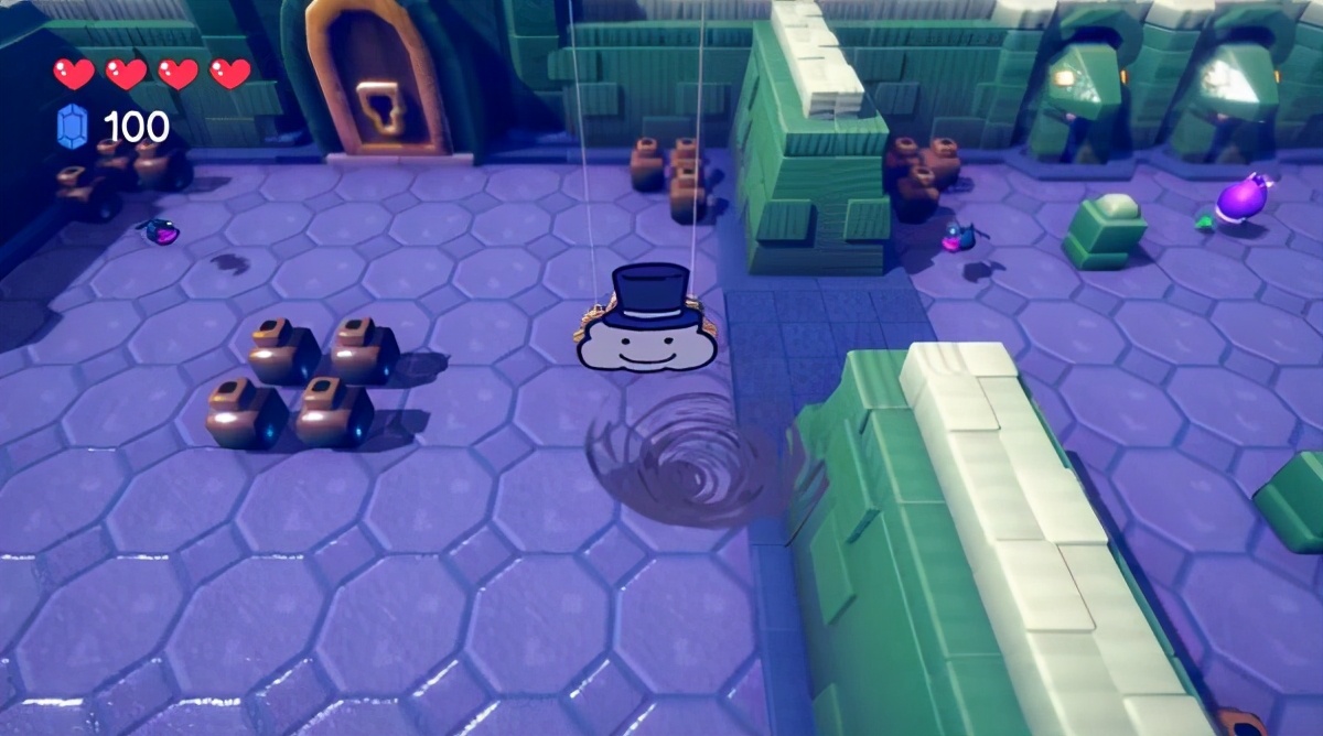 在这一关里,小白云的攻击方式从下雨变成了下像素剑,而从收集的宝石,和右上角经过修改的AI来看,这都是在玩《勇者斗恶龙》的梗。