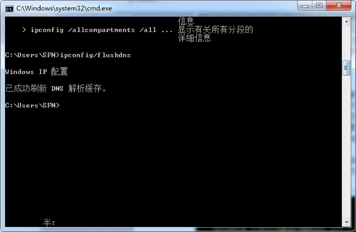 (3)执行ipconfig/flushdns命令,当出现“已成功刷新DNS缓存”的提示时说明当前计算机的缓存信息已经被成功清除。
