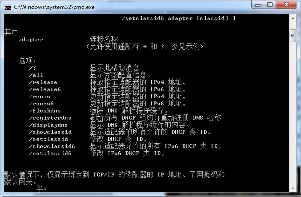 (2)输入ipconfig/?,可看到有一个名为/flushdns的命令,通过执行该命令可以清除DNS缓存信息。