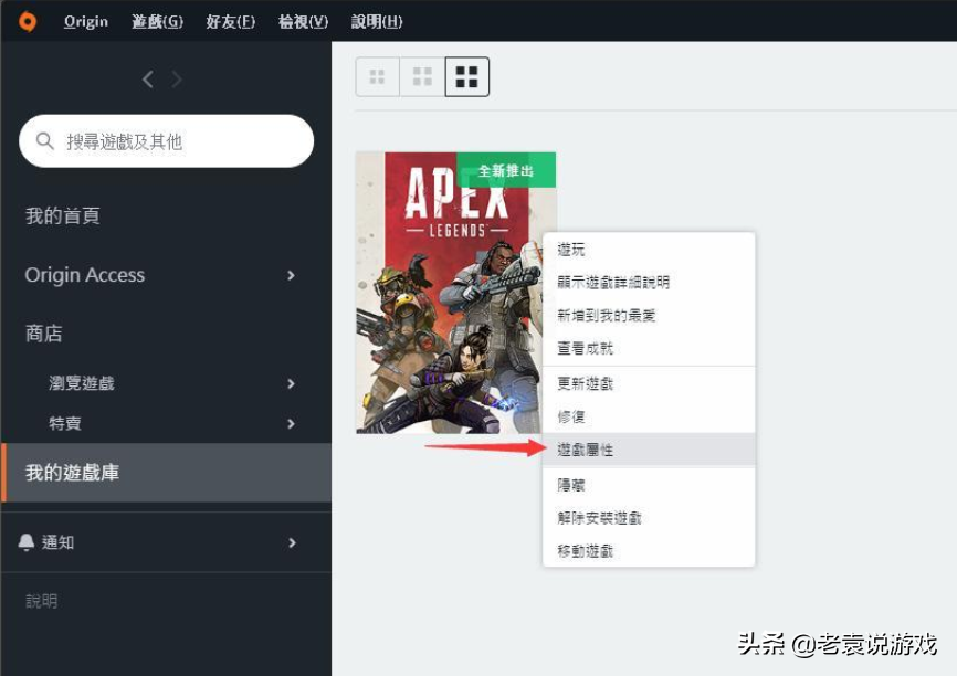 玩家先打开origin客户端,在游戏库中找到apex英雄,并用右键点击,选择游戏属性。