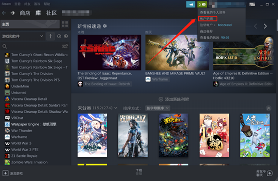登录Steam账号之后,点击客户端右上角自己的小头像,会显示如上图右上角所示的菜单栏,点击“账户明细”。