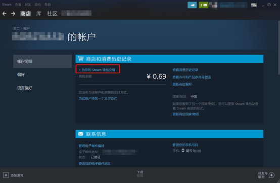 进入账户明细后,点击如上图所示的“+为您的Steam钱包充值”。