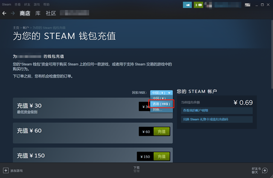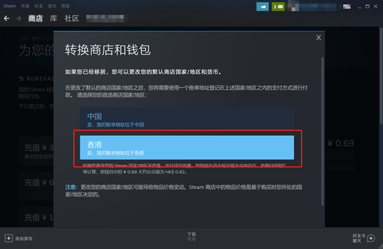 接下来会弹出如上页面,点击上图中红框的香港即可。说句题外话:玩家购买锁区游戏也可以通过这个方法,前提是先保证账户有钱,然后走到这一步之后就可以去商店对喜欢的锁区游戏添加购物车付款了。