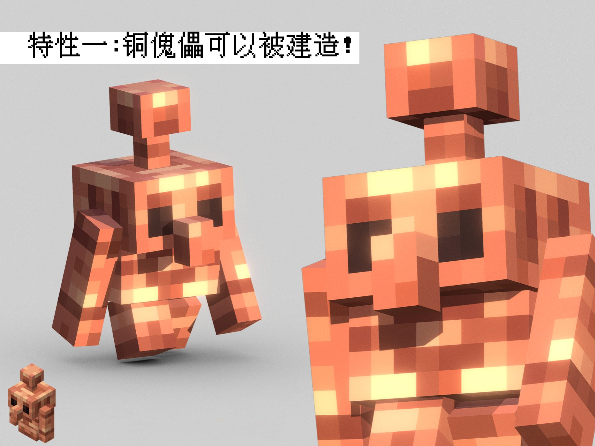 像《我的世界》的铁傀儡一样,玩家可以自行建造铜傀儡,但因为体积比较小,虽然预告片中Jeb和Agens用了三个铜锭,但铜锭不可以摆放在地上,所以建造材料应该还是铜块。加上铜傀儡头顶一个类似避雷针的物品,所以可能还需要一个避雷针。