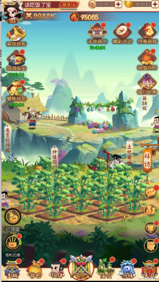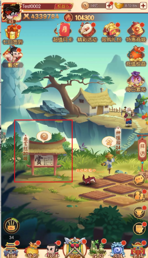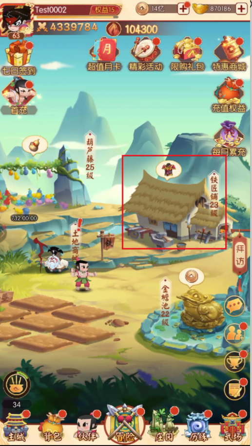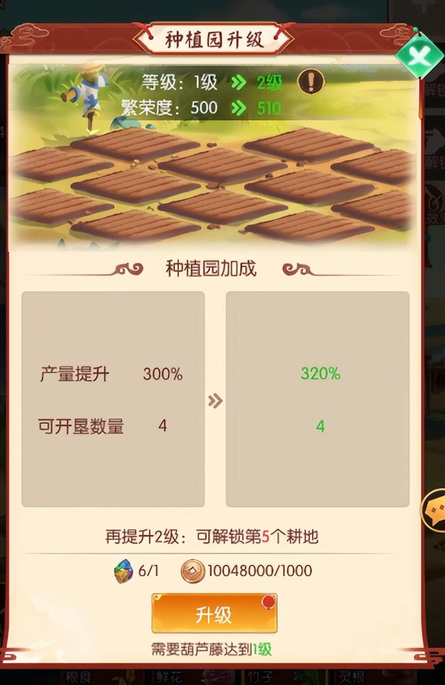 庄园的入口就在主界面下方常驻按钮,庄园内有葫芦藤、种植园、悬赏栏、铁匠铺和金蟾池,每个建筑的成长可提升收益以及庄园的繁荣度。所有建筑初始等级为1,点击任意建筑即可打开对应的建筑界面,在界面内点击升级即可对建筑进行升级。