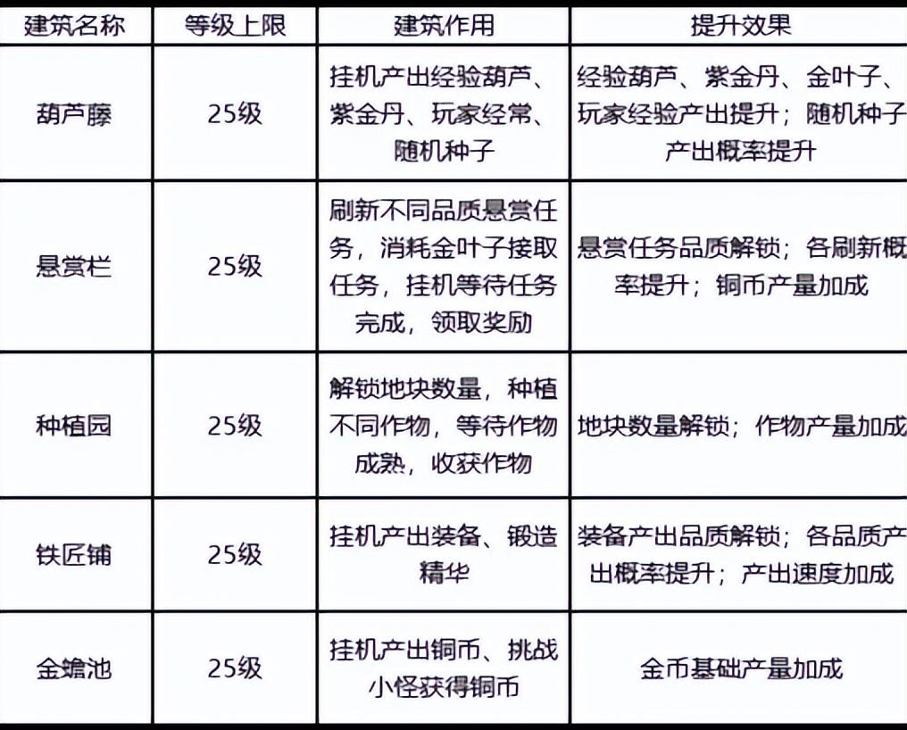 不同建筑的作用、等级上限、升级提升效果具体如下: