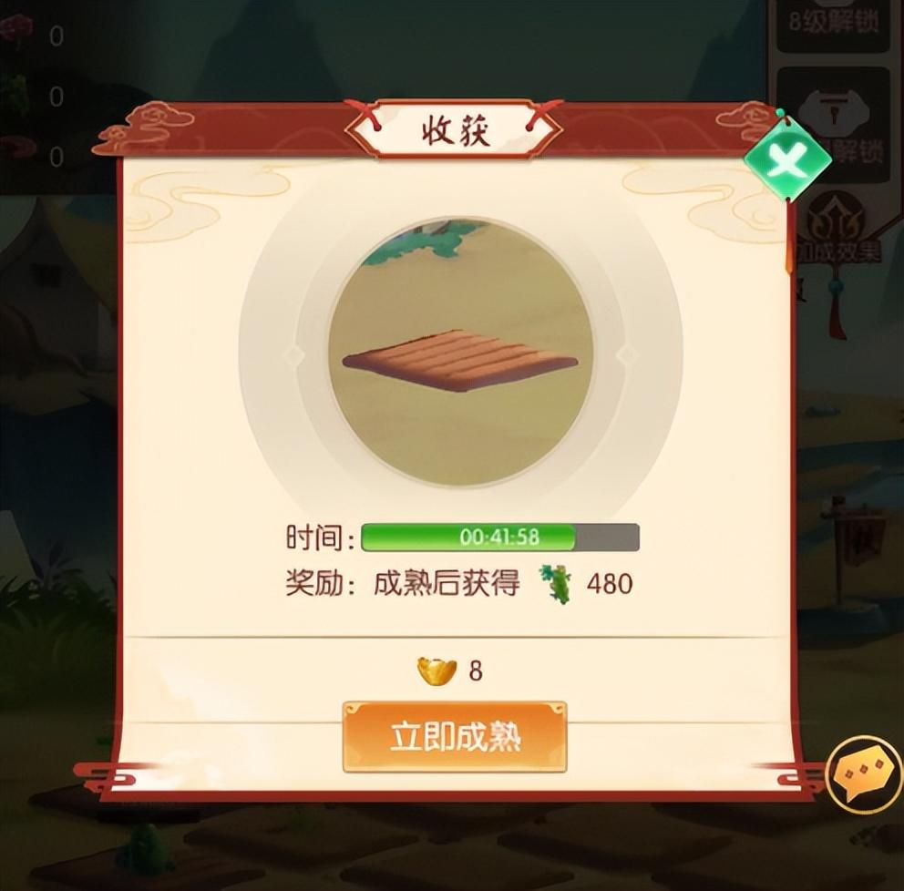 还可通过点击界面右下角背包按钮,打开背包页面且切换至种子页签,可查看已拥有的种子。作物未成熟且无时间时,点击地块会弹出立即成熟确认弹窗,在该弹窗内可消耗一定数量的货币使作物立即成熟。