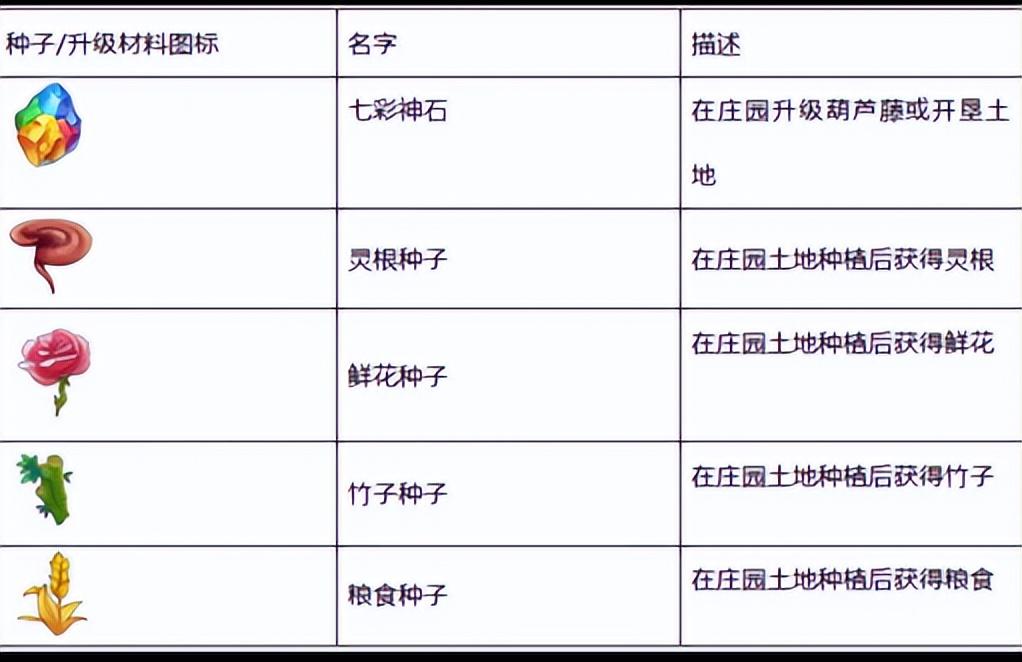 详细种子信息及升级材料见下表