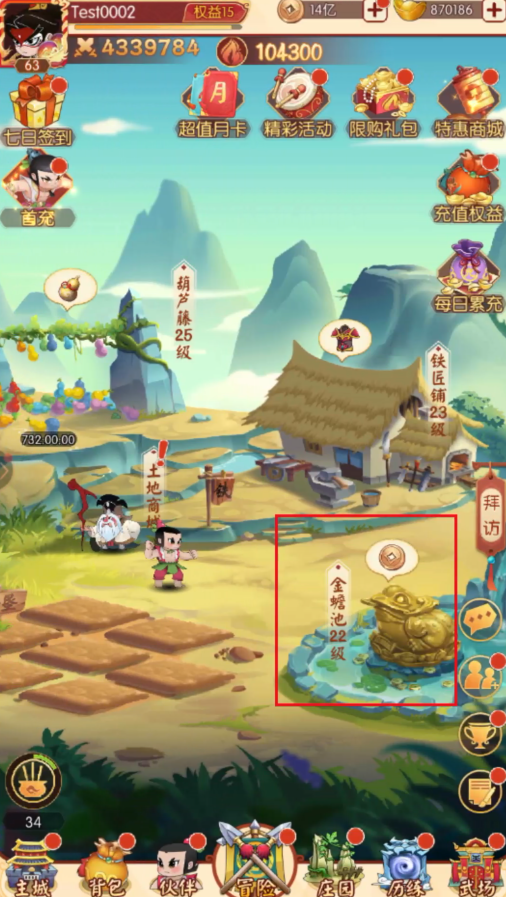 点击金蟾池建筑,可打开金蟾池界面,该界面内可对金蟾池进行建筑升级、派驻伙伴增加铜币产出、挑战小怪获得额外的铜币奖励。