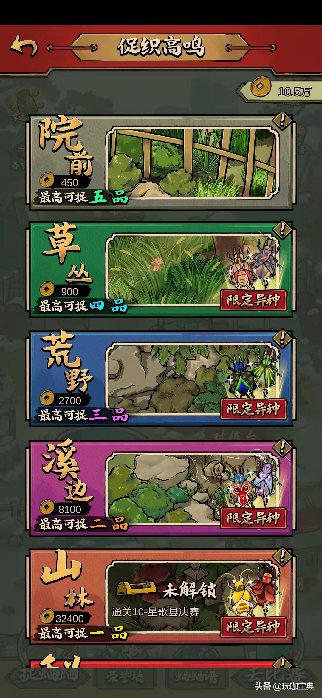 游戏中的蛐蛐一共有九个品级,每个品级中还有着颜色区别,玩家需要在不同地点去抓捕这些蛐蛐。根据地点的不同,玩家花费的铜币,蛐蛐的品质也有所不同。