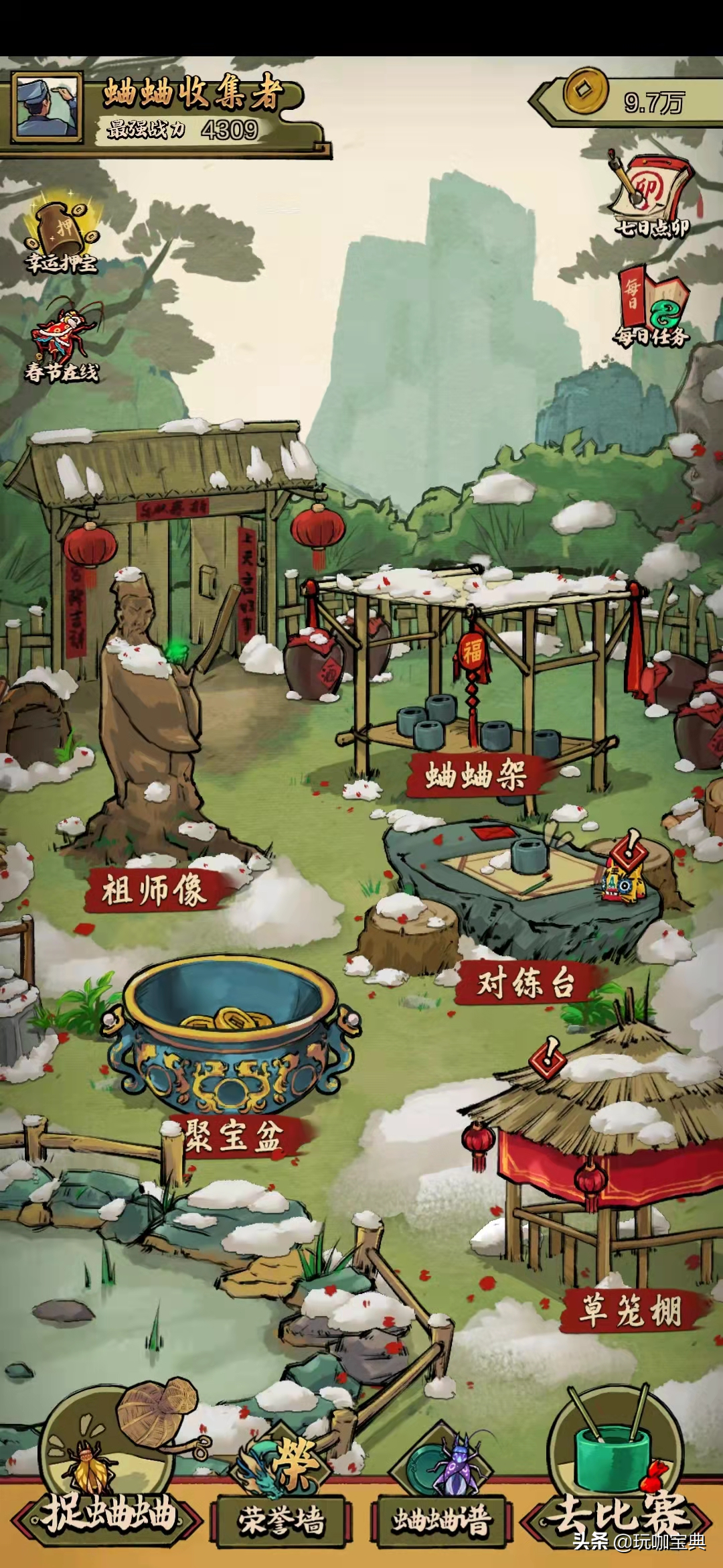 游戏中有着蛐蛐架(加快血量恢复)、祖师像(提供战斗BUFF)、聚宝盆(领取铜币)、对练台(有限的提高蛐蛐战斗力)、草笼棚(制作草笼),这些功能简单的形成了一个捕捉—战斗—修养—捕捉的循环。
