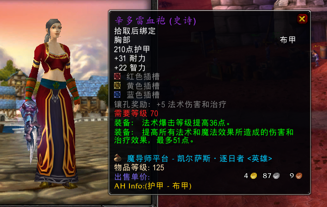 小探给大家推荐的优质散件只有1件,那就是法系DPS可以使用的辛多雷血袍。这套长袍拥有36暴击等级、51点法伤和3孔,我们可以拿它和海巫外衣做一个比较,海巫外衣是21暴击等级、57法伤和3孔,基本属性和辛多雷血袍基本一样,海巫外衣唯一的优势多了27点法术命中,在目前法系DPS队伍大多配有元素萨的天怒图腾背景下,27点法术命中并不是一个必须属性,而到了太阳井之后大家都是要换成阳炎,因此辛多雷血袍完全可以作为海巫外衣的低配版使用,拿来开荒太阳井也毫无问题。