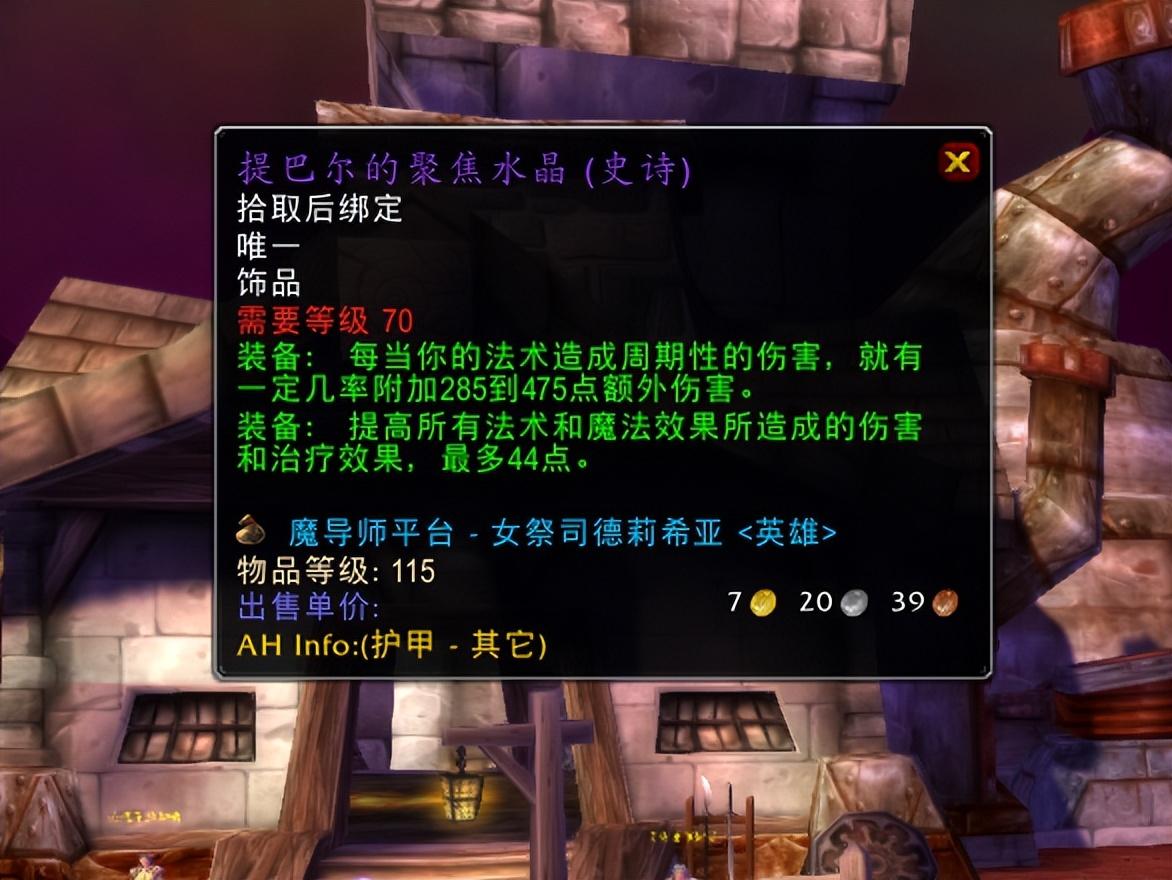 提巴尔的聚焦水晶的主属性只有44点法伤,算是平平无奇,主要看点是285~476的额外伤害,可惜这个伤害也有45秒的内置CD,小探曾经给大家介绍过同样有45秒内置CD的破碎残阳DPS项链的特效平均伤害超过500点,一个饰品的特效还没有项链特效强,因此这个饰品非常鸡肋,还不如银月徽记和夸眼,仅推荐小号使用。