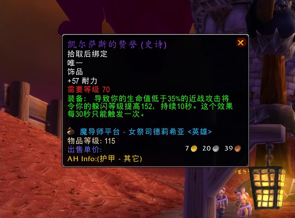 凯尔萨斯的赞誉不用多说,这就是坦克们的极品饰品,既增加基础生命值,还有自动挡的152点躲闪等级,可以说又省心又给力,三大坦克都可以使用。注意被动特效每30秒就可以触发一次,TBC版本中这种内置CD这么短的饰品非常少见,小探就知道一个龙脊奖章的内置CD是20秒,这个设计实在太良心了,相当于每半分钟就有一次小号炽热防御者。