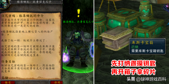 格洛姆托要求玩家击杀纳迦摸钥匙,再用钥匙开库斯卡宝箱,寻找诅咒密码的第一块碎片。宝箱里面并不一定会开出诅咒密码,也有其他的零碎,耐心找吧。