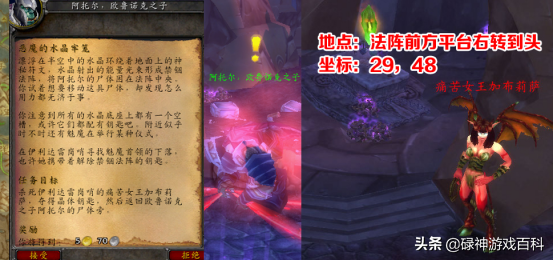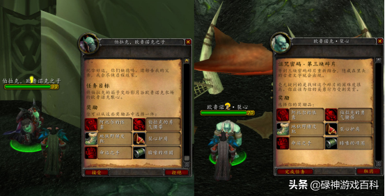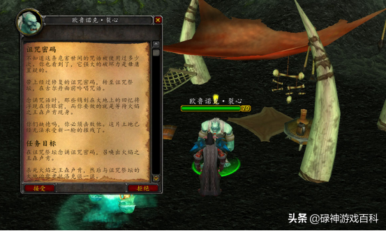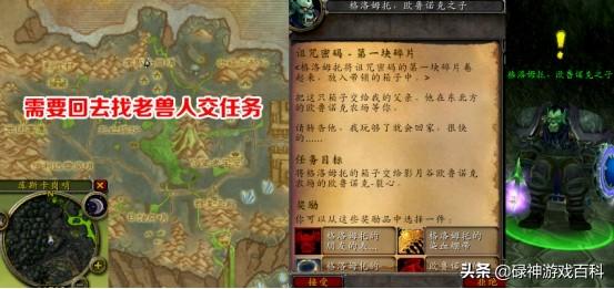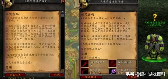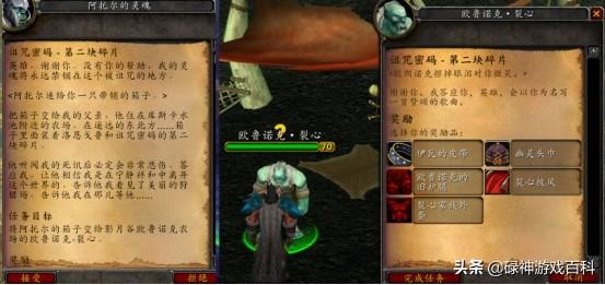 带上三块碎片,脚男回到了破碎岩床的农场向老兽人交任务。奖品很丰富,根据自己的装备来,要么挑对的,要么挑贵的。老兽人将三块碎片修复成了真正的诅咒密码后,要求玩家前往诅咒祭坛,在古尔丹面前吟唱咒语,召唤火焰之王森卢肯并击杀之。