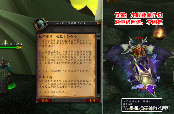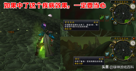 这里要特别提醒,在鸦人营地开腐烂的鸦人之卵,如果没开出任务物品,会中一个叫做“溃烂”的疾病DEBUFF,会受到周期性伤害。最恶心的在这个DEBUFF持续过程中,每过几秒就会有“重度疾病”效果,会口吐绿水,昏迷5秒,每秒受到90到150点自然伤害。所以中了之后一定要特别小心,千万不要AOE杀怪,否则昏迷5秒足够你见天使姐姐了。