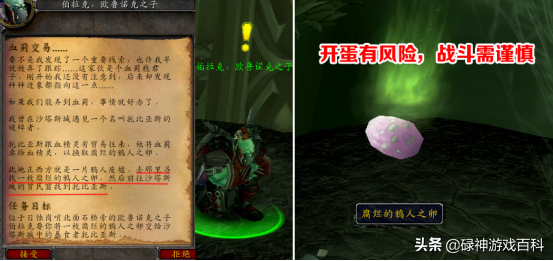 伯拉克想要用血蓟勾引血精灵特使,他要求玩家去正西方的鸦人废墟寻找一枚腐烂的鸦人之卵,然后交给沙塔斯城的托比亚斯。