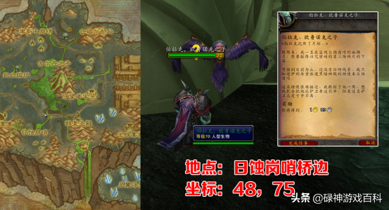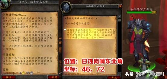 心灵手巧的伯拉克将日蚀护肩改造成了血精灵伪装,要求玩家伪装成血精灵前往日蚀岗哨向总指挥官卢斯克传达口信。指挥官卢斯克在日蚀岗哨的东北角,坐标46,72,是72级精英,带两个牛叉护卫。使用伪装包后就成了绿名,使劲吓他就成了。这里需要注意的是,日蚀龙鹰会识破伪装,一定要小心,不然又得重新找伯拉克拿伪装包。