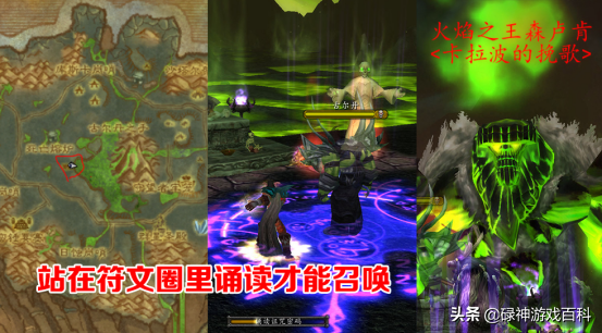 回到死亡熔炉下方的诅咒祭坛,看到古尔丹站在了祭坛前方的法阵中,在符文圈中使用诅咒密码,大地震动之后,火焰之王森卢肯现身。这时候老兽人欧鲁诺克.裂心会带着儿子们出现,与裂心对话,即可与火焰之王开战。这货比较猛,建议组队挑战。另外,开打前先清场,不然兽人援兵会攻击周围的火元素和土元素,带来不必要的麻烦。