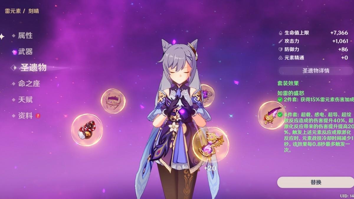 在激化队的圣遗物武器选择上,菲谢尔圣遗物最优选择是如雷2+攻击力2,圣遗物主词条选择攻雷暴,武器可以选择四星精五绝玹,当然五星武器天空之翼和冬极白星更好。刻晴的圣遗物唯一选择如雷四件套,充分利用减CD来频繁释放技能打出更多激化反应。圣遗物主词条同样是攻雷暴,武器选择绿剑、雾切或者匣里龙吟。克莱圣遗物唯一选择草系四件套,主词条充精精,武器选择充能武器西风弓。最后钟离圣遗物选择千岩四件套,进一步提升雷C的输出,圣遗物主词条攻岩暴,武器选择护摩或者西风长枪。
