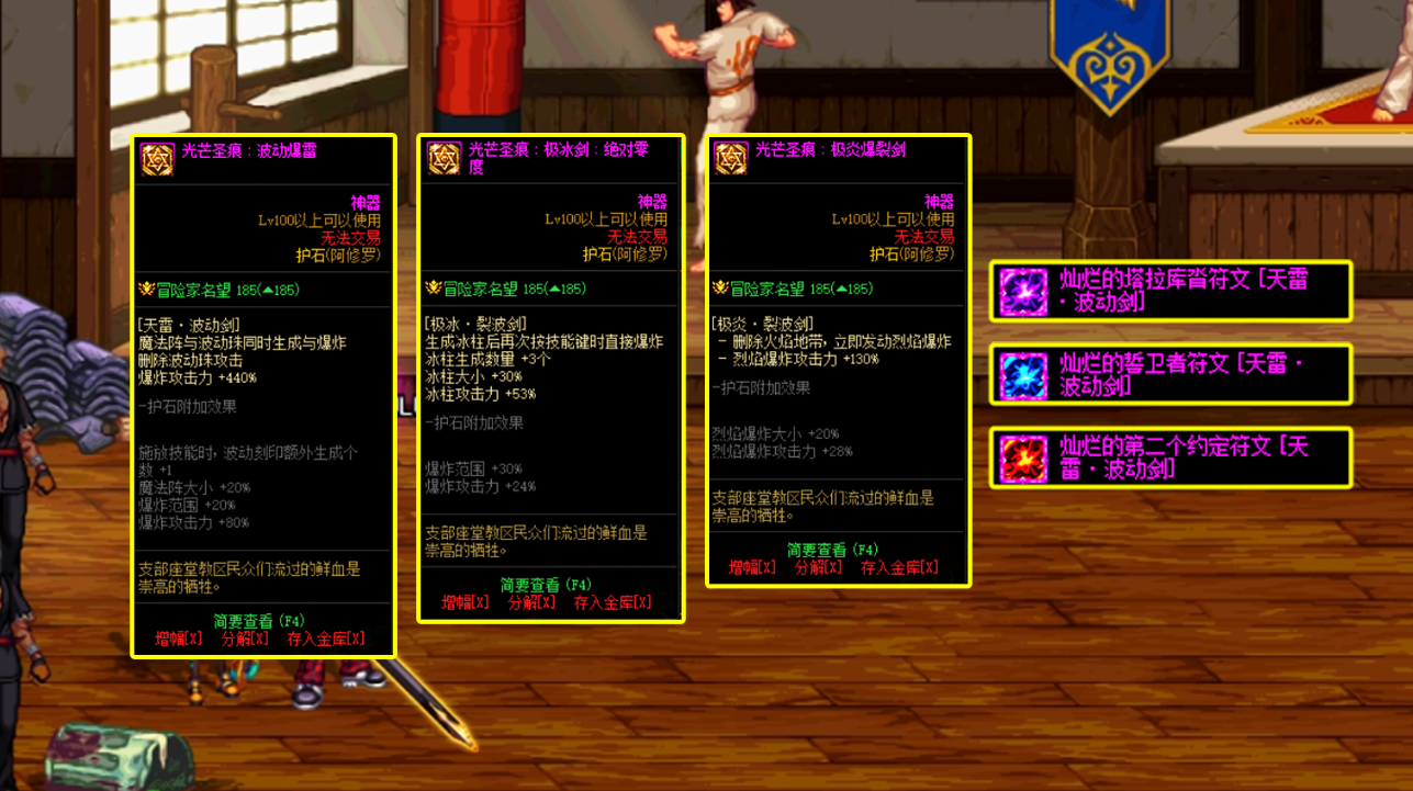 阿修罗的CP武器看起来并没有什么增加伤害的属性,主要是优化技能,增加杀意波动和邪光波动阵的范围;并且在施放小火,不动和天雷·波动剑可以无动作施放斜光波动阵的时候;不过词条3和和四的属性,对于小火的实际优化,个人觉得是负提升,贴脸打不到怪物,并且攻击的X轴小了。