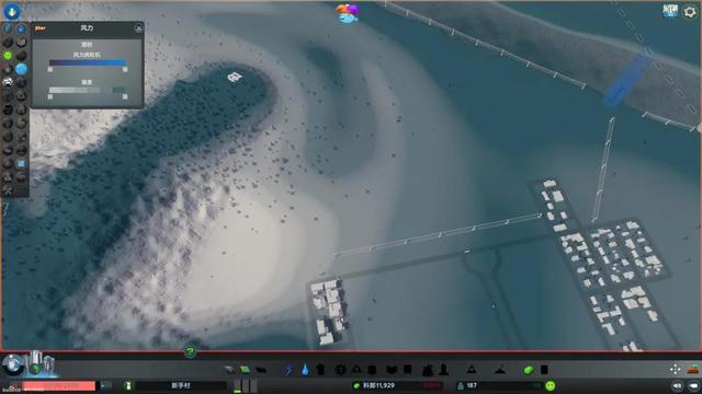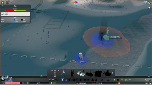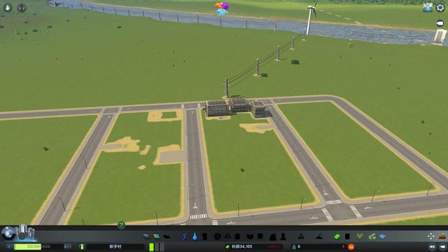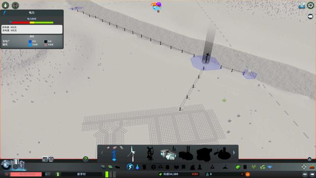 4.然后是铺设发电站和电缆。天际线初始提供的发电站有风力和火力两种,我建议直接all in风力发电站,污染小对游戏发展有很大帮助,也更美观。需要注意的是,风力发电站的发电效率和风速正相关,随着鼠标的移动,“预计生产量”,也就是预计发电量会变化,目测最大值是8兆瓦。电缆是电塔-电缆-电缆(A——A——A)的形式进行延伸,并且每隔一段距离自动放置一个电塔。同样地从风力发电站直接向主干道拉电线(不用担心占用空间,以后可以用图片右下角的“拖拉机”即清除工具拆除),并将抽水站、排水口和风力发电机相连,根据蓝色区域判断供电区域。