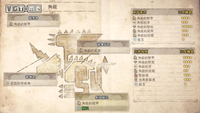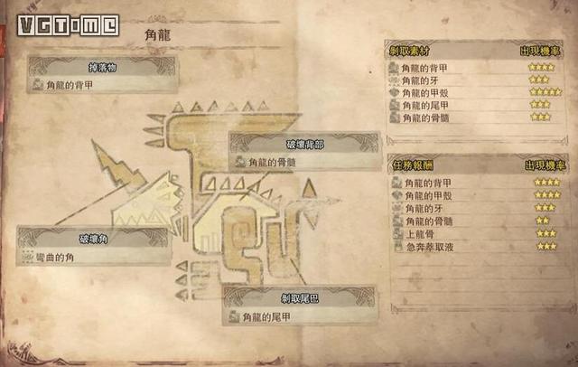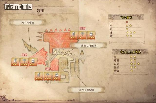 角龙属性方面主要弱冰,弱点在头部、翅膀、身体下方,角和尾巴特别坚硬。此外,麻痹对角龙也非常有效。