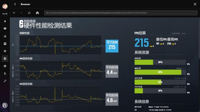 《彩虹六号:围攻》有自带的 Benchmark,实测在高画质下武士 66 能跑到 215 帧,游戏体验出色。