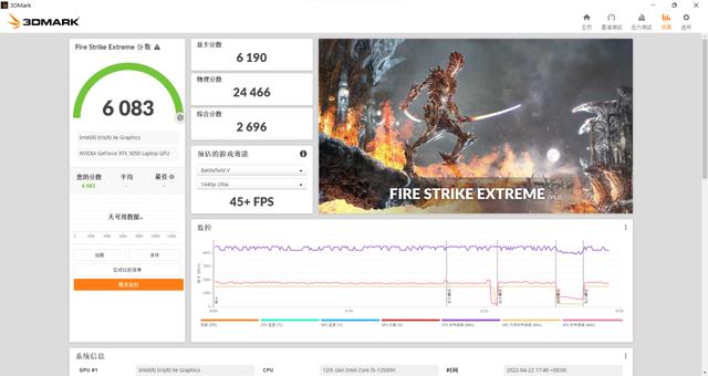 3DMark FireStrike Extreme 同样能跑到 RTX 3050 的正常分数,实测分数为 6190 分。