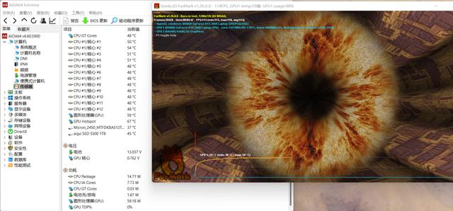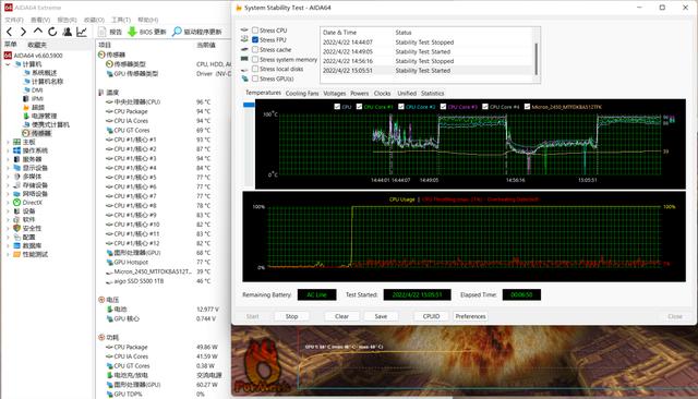 接下来我们同时运行以上两款软件,模拟最大的压力,运行 15 分钟的双烤。15 分钟后 CPU 稳定在 50W、96℃,GPU 稳定在 60W、77℃,这个性能释放对于 i5+3050 的笔记本还是相当不错的。