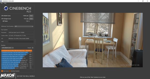 在 R23 中,则达到了单核 1731 分和多核 13693 分,同样有着不小的提升,看来 12 代酷睿真的相当给力。