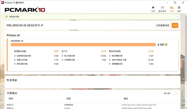 当然,也有不少消费者们买游戏本是为了在创意生产工作中获得更强的性能,比如用 Cuda 核心为视频剪辑和模型渲染来加速。我们接下来测试一下生产力软件。首先是代表综合办公性能的 PCMark10。得分为 6181 分,可以应对大多数所有的日常办公需求。