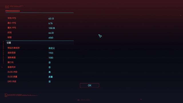 最后一游戏是《赛博朋克 2077》,它最近更新了 BenchMark,因此结果会更加客观。在 1920*1080 分辨率高画质下,不开光追帧率可以稳定在 63 帧上下,游戏体验不错。