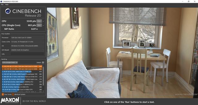 在代表 CPU 理论性能的在 R20 中,获得了单线程 664 分,多线程 5349 分的成绩。相比于上一代主流的 i5-11400H 不论是单核多核都有突飞猛进的提升。