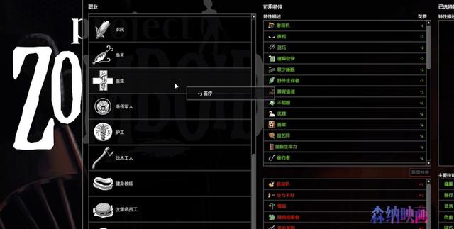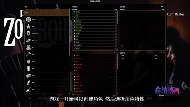 作为一款生存类游戏,这款游戏目前算得上是可玩性和深度非常强的游戏了。游戏一开始可以创建角色,然后选择角色特性,上面的是它的一些跑的快,负重多,攻击力强,不易生病等正面特性。下面是一些体力差,哮喘,失眠等负面特性,角色有一些特性点数,选择正面特性会消耗点数,而适当的添加一些负面特性,则可以获得更多的点数。意思就是如何选择正负两面的特性,来达到你最想要的人物擅长效果。而左侧的话会有一些职业选择,可以根据你想要的发展方向选择一些职业。