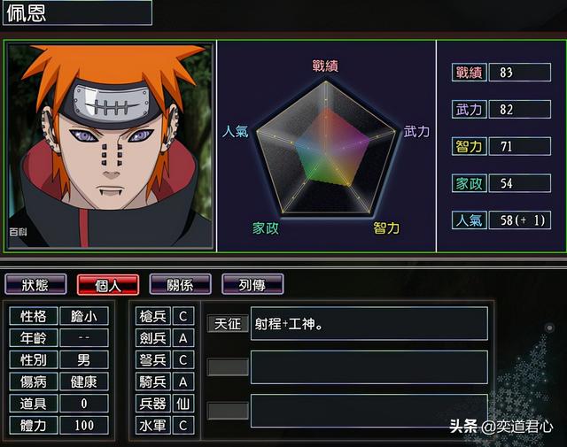 佩恩(战绩83、武力82、智力71、家政54、人气58)