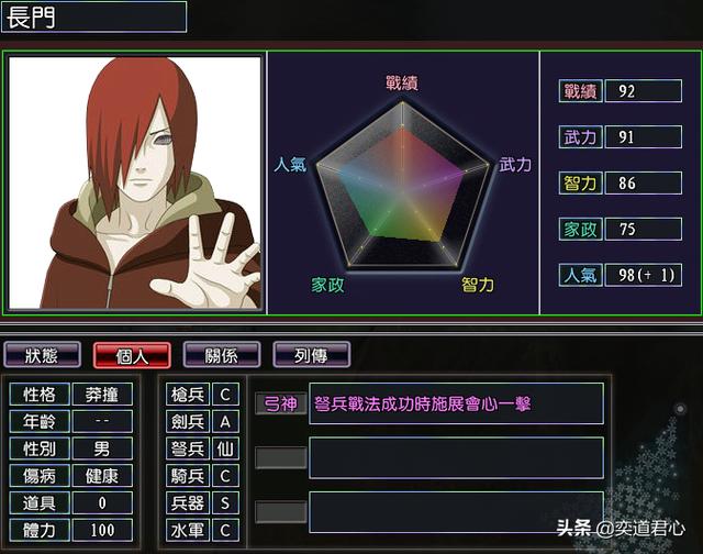 长门(战绩92、武力91、智力86、家政75、人气98)