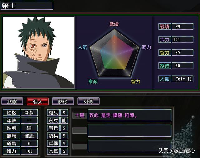 宇智波带土(战绩99、武力101、智力87、家政80、人气76)