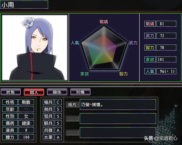 小南(战绩81、武力72、智力78、家政101、人气96)