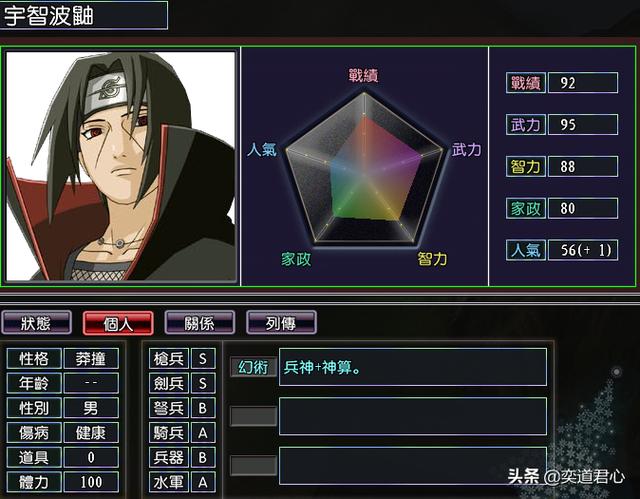 宇智波鼬(战绩92、武力95、智力88、家政80、人气56)