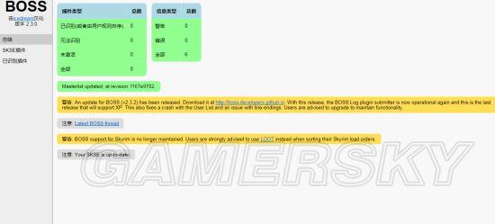 5.模组排序工具BOSS(boss下载地址:)和Loot(loot下载地址:),对于模组进行人工方法和机器方法排序,更正模组加载顺序,稳定游戏。解决游戏崩溃和卡死,必备。应用也非常方便,以boss来举例。请任意解压到一个文件夹中,然后运行BOSS GUI.exe,之后也是选择游戏。每次用NMM加载完模组后,都要进行一次排序。