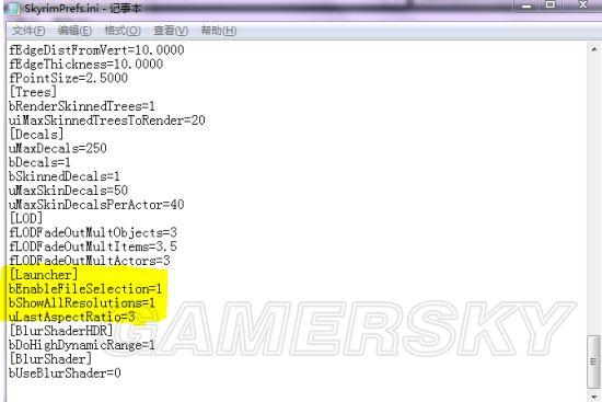 4.上古卷轴5 SkyrimPrefs.ini 文件 游戏配置文件,可修改游戏画面参数,SkyrimLauncher.exe运行后提示完成会自动生成。打开文档,有一列是[Launcher],如果SkyrimLauncher.exe启动后模组文件为灰色无法点开,那么在[Launcher]下添加bEnableFileSelection=1,如果没有bShowAllResolutions=1 uLastAspectRatio=3这两列,也请添加。如果ini文件出现问题,可以删除在运行exe生成。