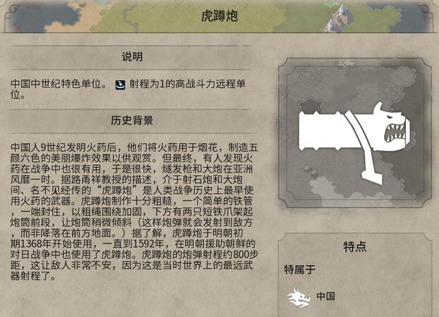 之后就是特殊单位了,秦始皇的特殊单位为虎蹲炮,虎蹲炮属性为移动2、近战攻击力30、远程攻击力50、射程1。这个特色单位是中世纪单位,介绍为:射程为1的高伤害单位。不过不少人对于虎蹲炮是不太感冒的,虽然在历史上这款武器非常给力。但是在文明6里面,同期单位对比的话,性价比不是太高。进攻不足,但是防守的话,还是可堪一用的。