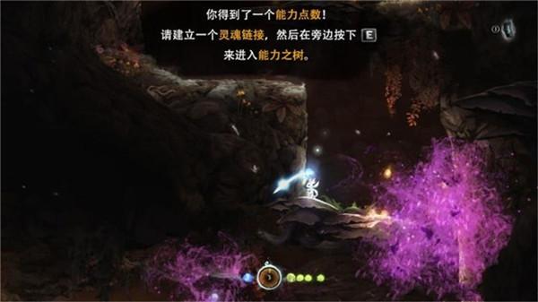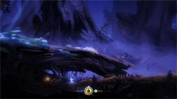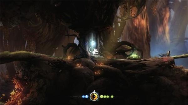 4、继续往左侧推进,此时会看见一棵巨大倾斜的树干,先走到树干下,在树干底下会发现一个能力核心。跳上倾斜的树干,在左侧的死胡同处,按鼠标左键让奥日捡起一道小小光芒,这道光芒是一个名为赛安的精灵,他是精灵之树的双眼与光芒,此时奥日获得了第一个技能精灵之火,这里就相当于是第一个圣地(奥日获得圣地当中的技能之后可以获得一次自动存档的机会)。注:圣地是获得技能的地方,是流程必经之地,所以在本文之中,它不会算作是收集品之一,但小编会用对每一个圣地都会用颜色来加以区分。